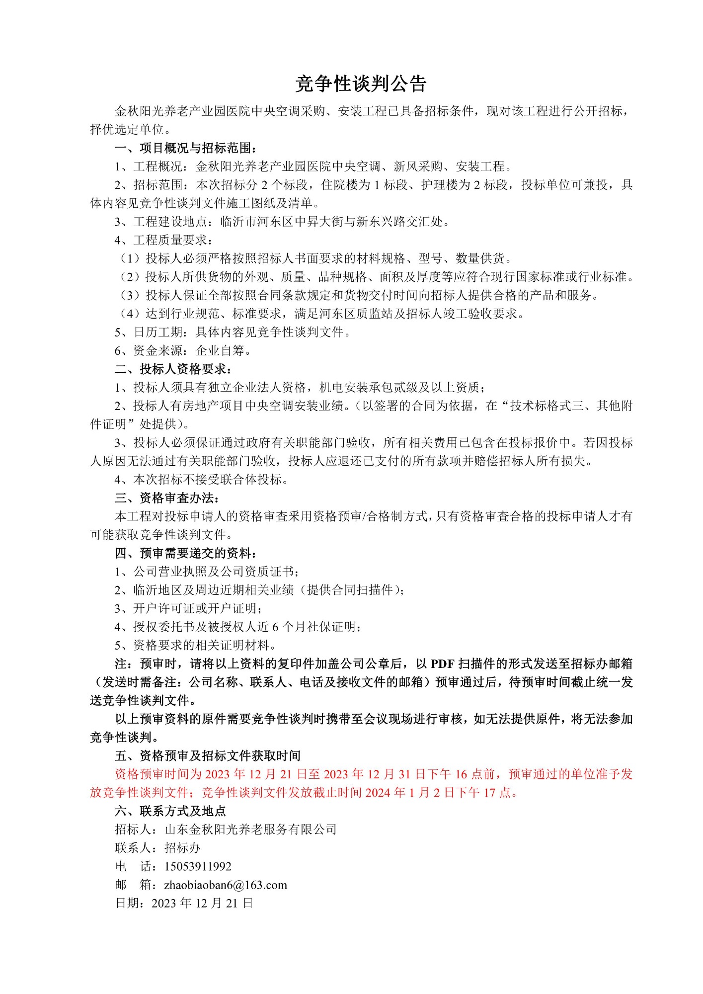 金秋阳光养老产业园医院医气系统工程竞争性谈判公告